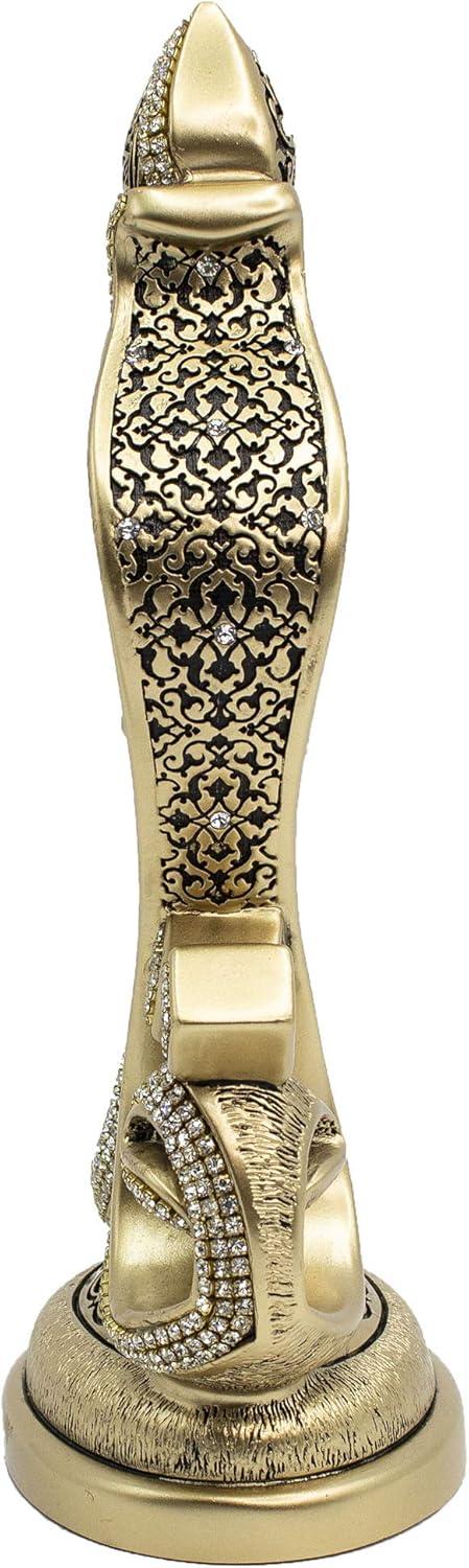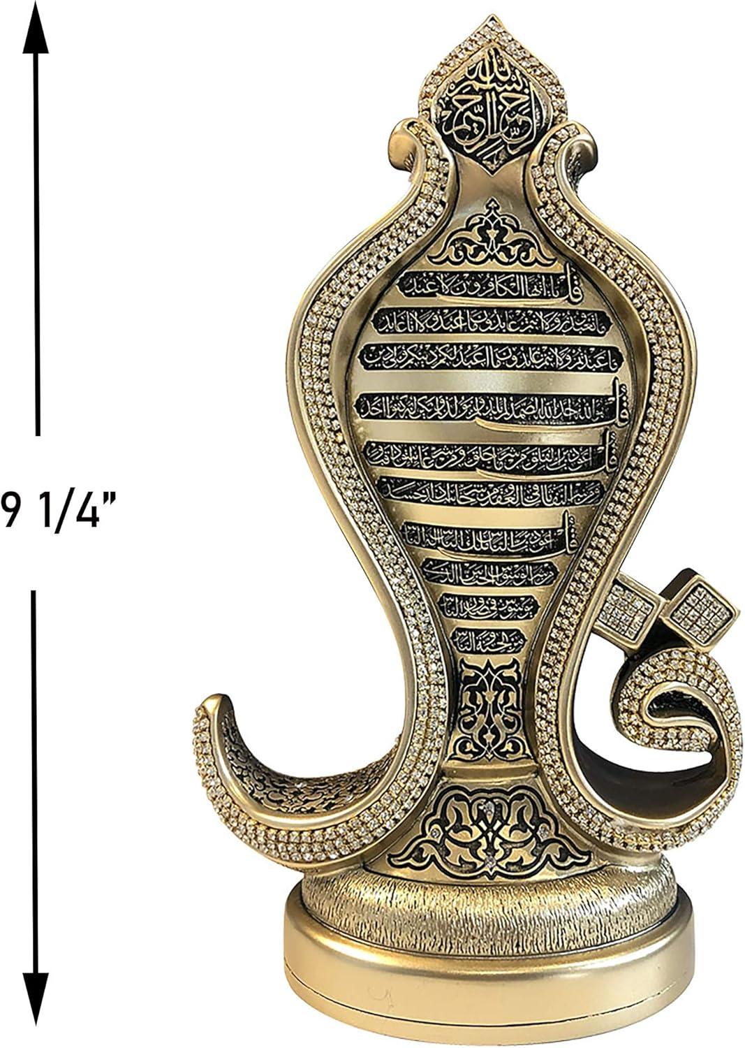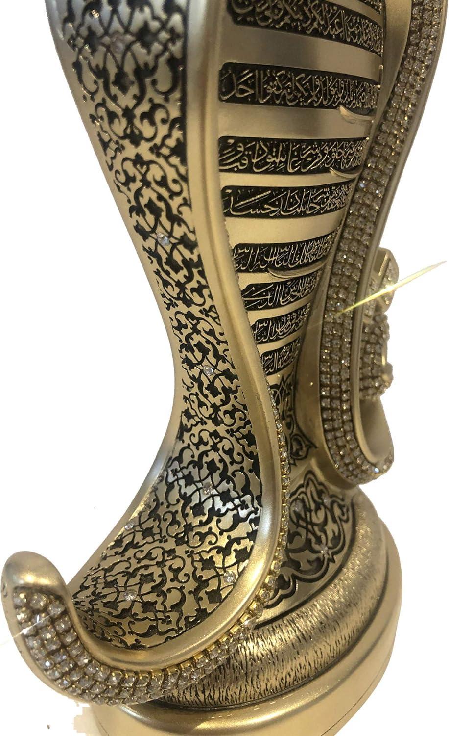 Enhance your space with this stunning Islamic table decor showpiece featuring the revered 4 Qul Surahs (Al-Kafirun, Al-Ikhlas, Al-Falaq, An-Nas) in detailed Arabic calligraphy. This elegant Islamic home decor item blends spirituality with artistry, making it a meaningful addition to your Muslim home decor, masjid decor, or islamic prayer corner. Crafted in Turkey, this decorative sculpture showcases a best Islamic gift design, embellished with rhinestones for a luxurious look. It’s a timeless piece of Islamic art made of durable resin and plastic, ideal for any room or display shelf. Perfect for special occasions, this makes a thoughtful Islamic gift for Ramadan, Eid Mubarak, Hajj, or Umrah. Whether you’re searching for Ramadan gifts for women, Eid gifts for men, or Islamic decorations for home, this item fits beautifully into many gifting moments like Ramadan iftar decor, Eid al Adha decorations, eid decor or Ramadan kareem gifts. Great as a Muslim decoration for home, Eid table decor, or Ramadan dining table centerpiece, it complements Arab decor and creates a spiritual atmosphere. Ideal for Eid decorations for home, Islamic Eid gifts, or Islamic decor for desk ideas. Product Details: Material: Resin & Plastic Size: 9.25” tall x 5.75” wide Weight: Approx. 1.68 lbs (3 lbs shipping weight) Use it as striking Islamic gifts for women or men, Eid Mubarak table decor, or display it in your Muslim prayer room decor. This decorative piece is a top choice for Ramadan and Eid gifts, Islamic showpieces, and best Islamic gifts for home for loved ones.