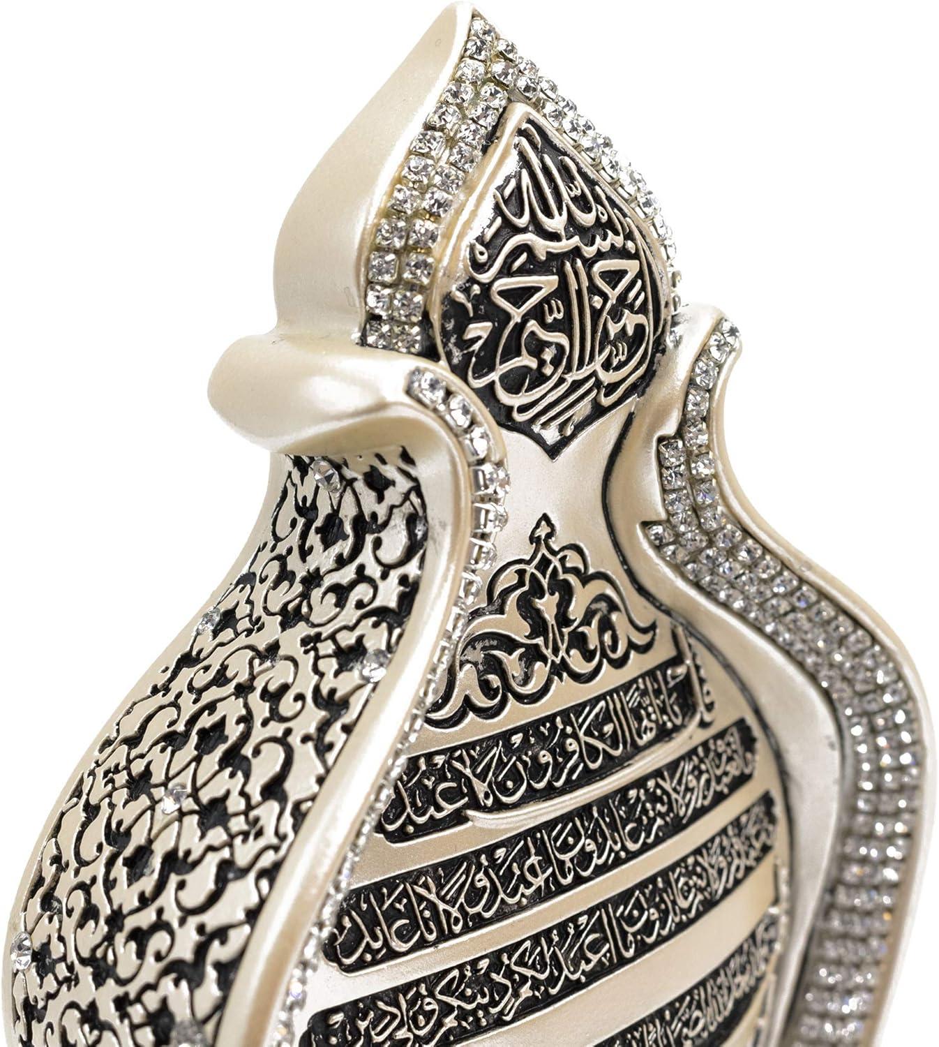 Enhance your space with this stunning Islamic table decor showpiece featuring the revered 4 Qul Surahs (Al-Kafirun, Al-Ikhlas, Al-Falaq, An-Nas) in detailed Arabic calligraphy. This elegant Islamic home decor item blends spirituality with artistry, making it a meaningful addition to your Muslim home decor, masjid decor, or islamic prayer corner. Crafted in Turkey, this decorative sculpture showcases a best Islamic gift design, embellished with rhinestones for a luxurious look. It’s a timeless piece of Islamic art made of durable resin and plastic, ideal for any room or display shelf. Perfect for special occasions, this makes a thoughtful Islamic gift for Ramadan, Eid Mubarak, Hajj, or Umrah. Whether you’re searching for Ramadan gifts for women, Eid gifts for men, or Islamic decorations for home, this item fits beautifully into many gifting moments like Ramadan iftar decor, Eid al Adha decorations, eid decor or Ramadan kareem gifts. Great as a Muslim decoration for home, Eid table decor, or Ramadan dining table centerpiece, it complements Arab decor and creates a spiritual atmosphere. Ideal for Eid decorations for home, Islamic Eid gifts, or Islamic decor for desk ideas. Product Details: Material: Resin & Plastic Size: 9.25” tall x 5.75” wide Weight: Approx. 1.68 lbs (3 lbs shipping weight) Use it as striking Islamic gifts for women or men, Eid Mubarak table decor, or display it in your Muslim prayer room decor. This decorative piece is a top choice for Ramadan and Eid gifts, Islamic showpieces, and best Islamic gifts for home for loved ones.