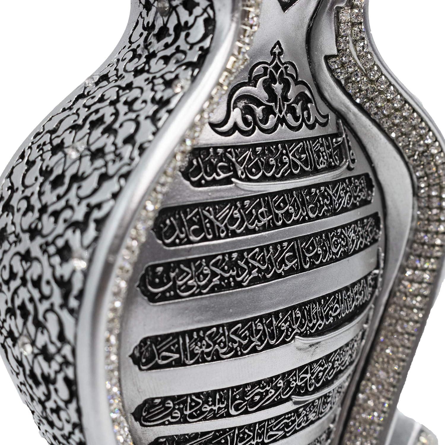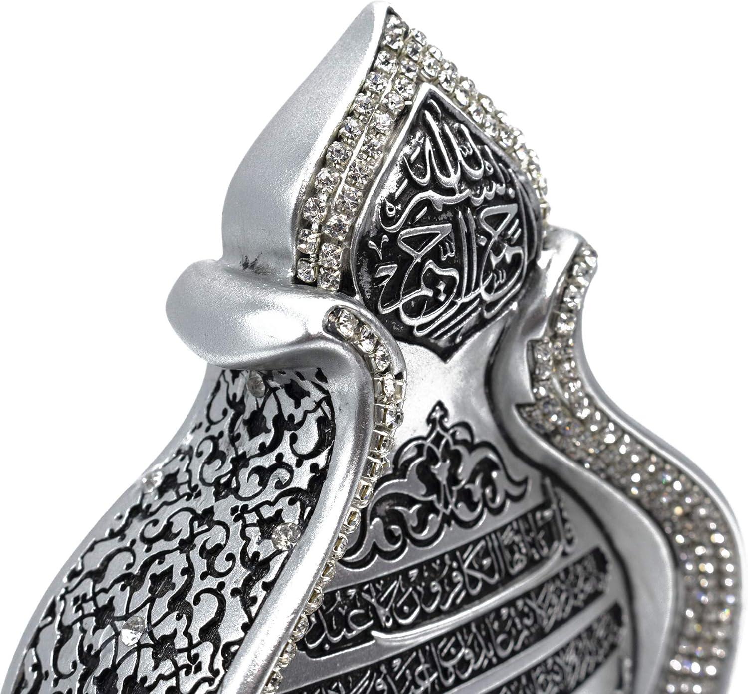 Enhance your space with this stunning Islamic table decor showpiece featuring the revered 4 Qul Surahs (Al-Kafirun, Al-Ikhlas, Al-Falaq, An-Nas) in detailed Arabic calligraphy. This elegant Islamic home decor item blends spirituality with artistry, making it a meaningful addition to your Muslim home decor, masjid decor, or islamic prayer corner. Crafted in Turkey, this decorative sculpture showcases a best Islamic gift design, embellished with rhinestones for a luxurious look. It’s a timeless piece of Islamic art made of durable resin and plastic, ideal for any room or display shelf. Perfect for special occasions, this makes a thoughtful Islamic gift for Ramadan, Eid Mubarak, Hajj, or Umrah. Whether you’re searching for Ramadan gifts for women, Eid gifts for men, or Islamic decorations for home, this item fits beautifully into many gifting moments like Ramadan iftar decor, Eid al Adha decorations, eid decor or Ramadan kareem gifts. Great as a Muslim decoration for home, Eid table decor, or Ramadan dining table centerpiece, it complements Arab decor and creates a spiritual atmosphere. Ideal for Eid decorations for home, Islamic Eid gifts, or Islamic decor for desk ideas. Product Details: Material: Resin & Plastic Size: 9.25” tall x 5.75” wide Weight: Approx. 1.68 lbs (3 lbs shipping weight) Use it as striking Islamic gifts for women or men, Eid Mubarak table decor, or display it in your Muslim prayer room decor. This decorative piece is a top choice for Ramadan and Eid gifts, Islamic showpieces, and best Islamic gifts for home for loved ones.