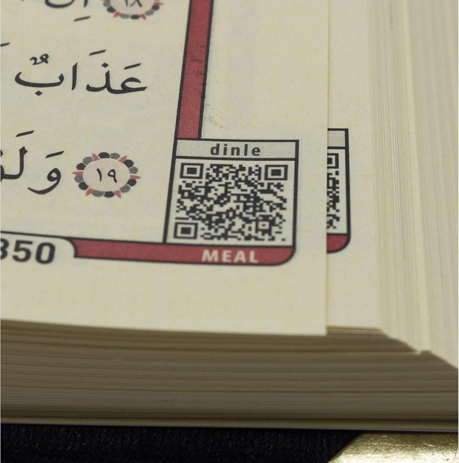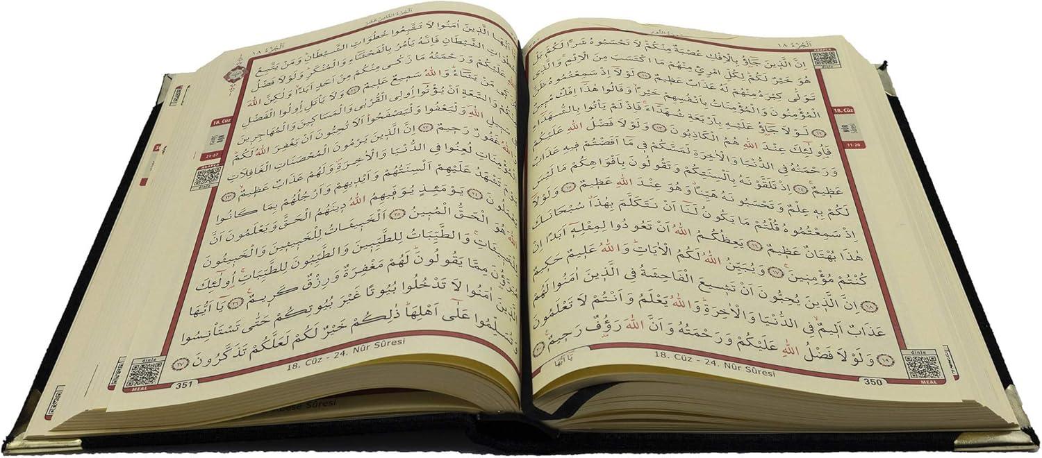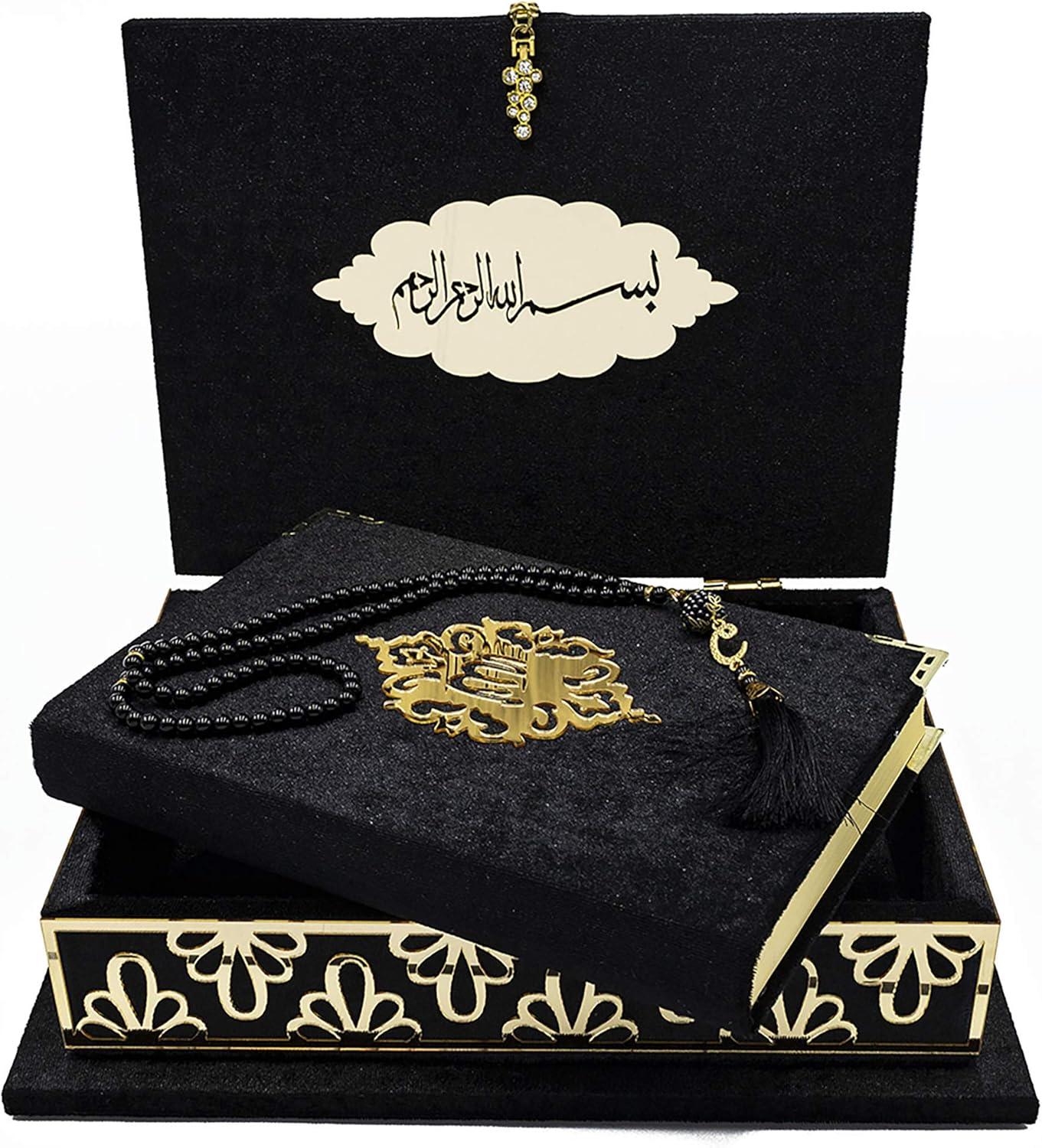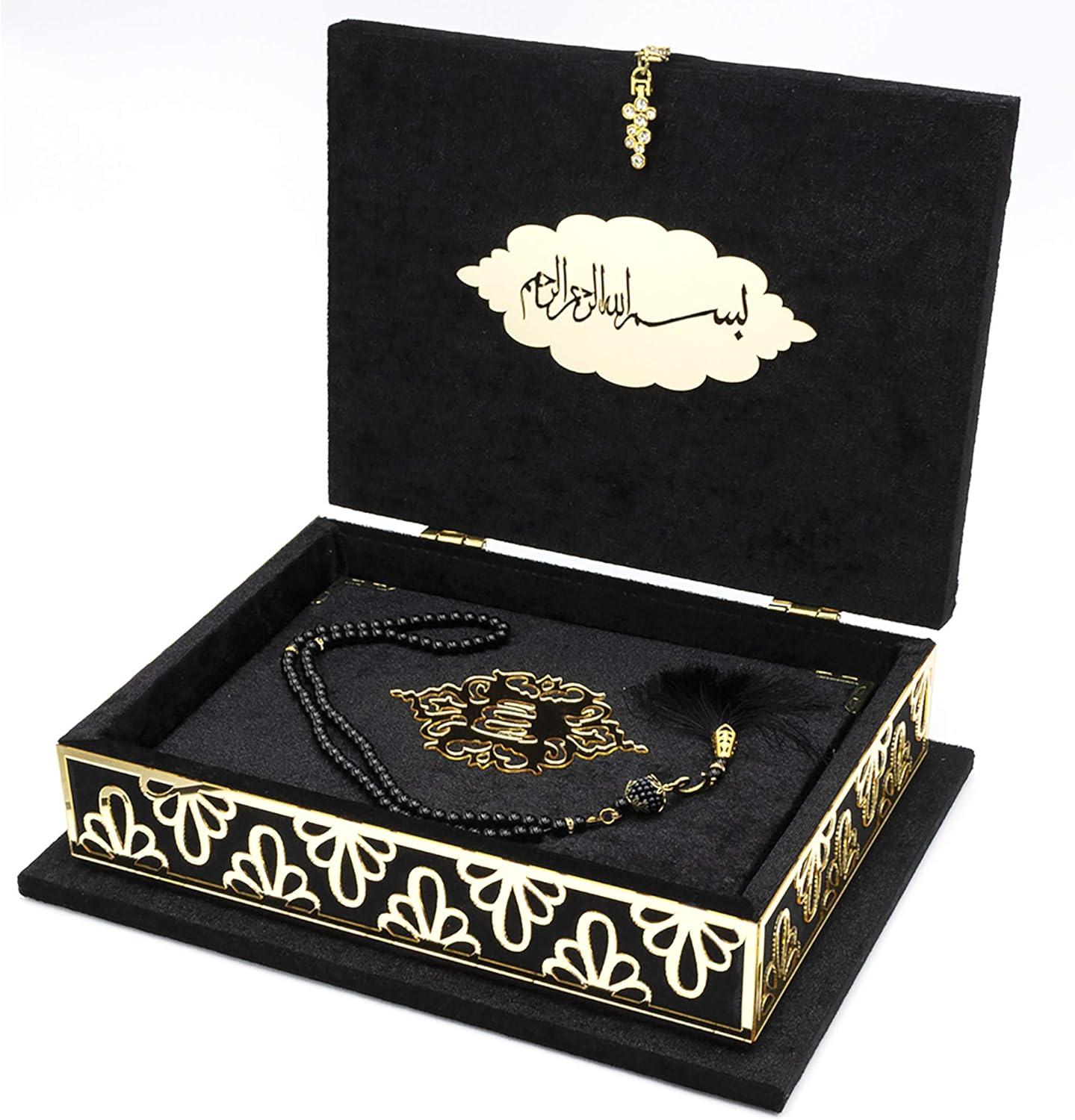 On the inside of the box, it says “Bismillah.” Includes Quran pictured, with cover that matches the box. Also includes tesbih prayer beads as pictured.