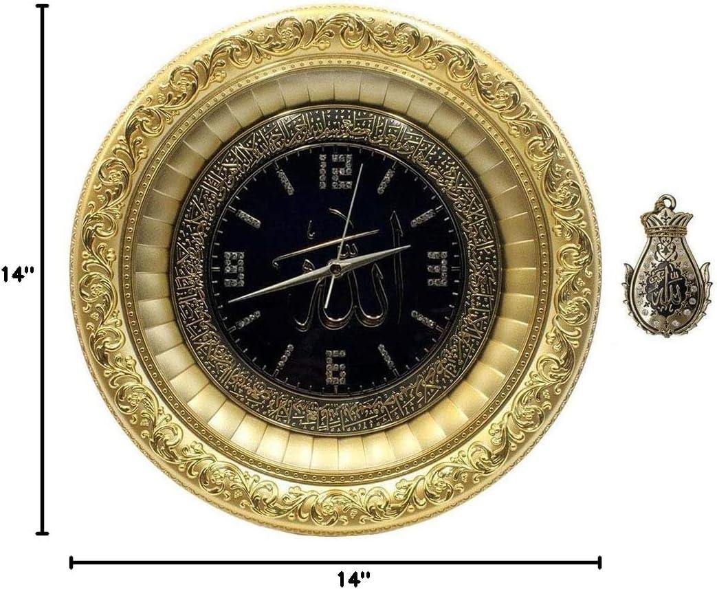 A beautiful and elegant Islamic clock! Features 'Allah' in Arabic calligraphy in the center, with Ayatul Kursi verse circling around the clock face. Also features intricate detailing on the frame. Accented with rhinestones to give it that one of a kind shine! May be hung on wall or on shelf using attached display stand. Comes with a free car hanger! Material: Resin. Size: 36cm diameter (14in). Takes one AA battery (not included). Made in Turkey.
