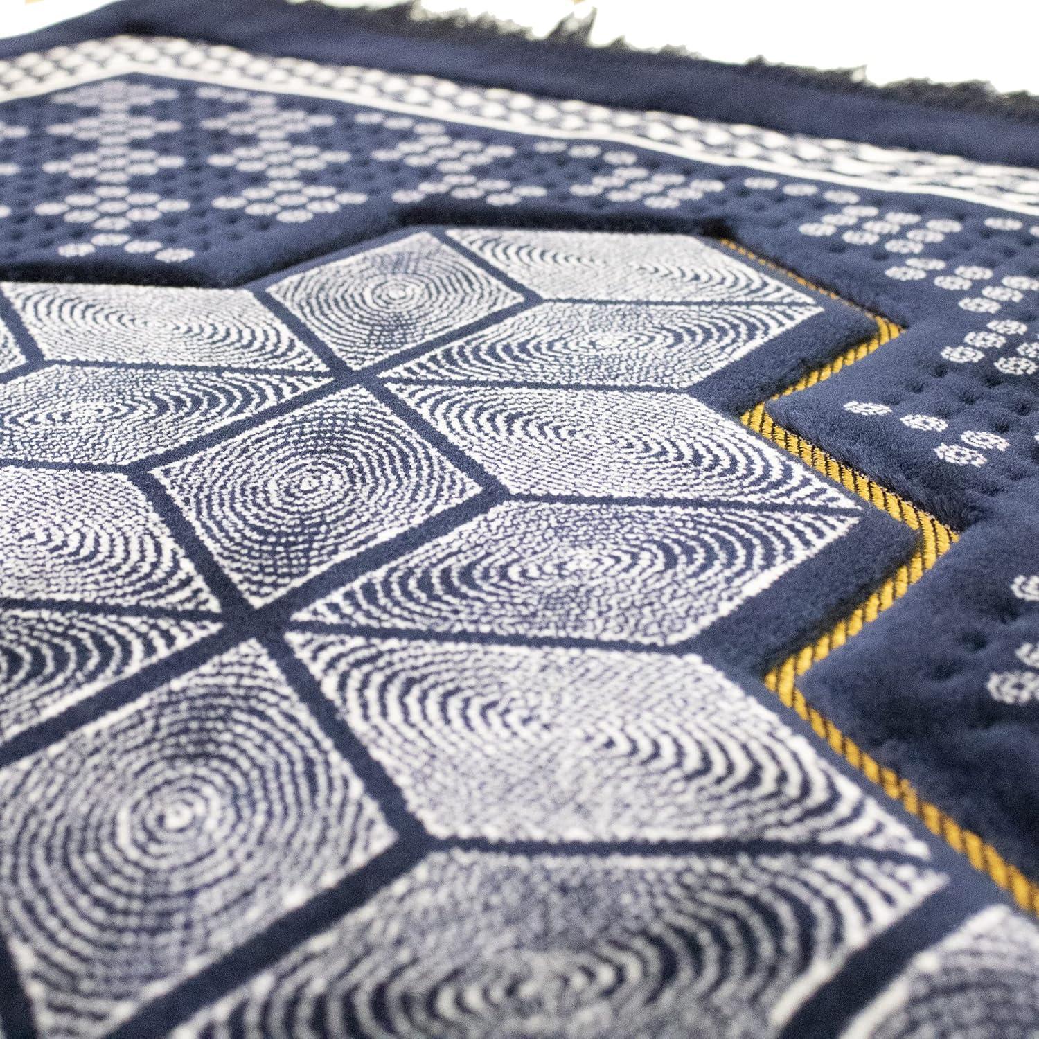 Modefa Turkish Islamic Velvet Prayer Rug - Thick Wide Soft Praying Carpet for Men & Women - Double Plush Large - Eid & Ramadan Gift with Kufi Beads & Car Hanger - Geometric Noor (Dark Blue)(Dark Blue)
