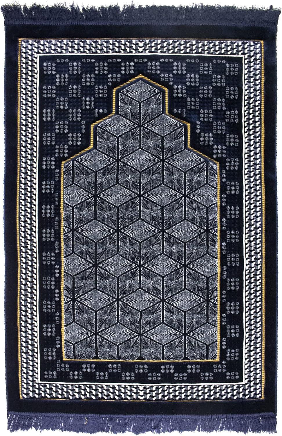 Modefa Turkish Islamic Velvet Prayer Rug – Thick Wide Soft Praying Carpet for Men & Women – Double Plush Large – Eid & Ramadan Gift with Kufi Beads & Car Hanger – Geometric Noor (Dark Blue)(Black)