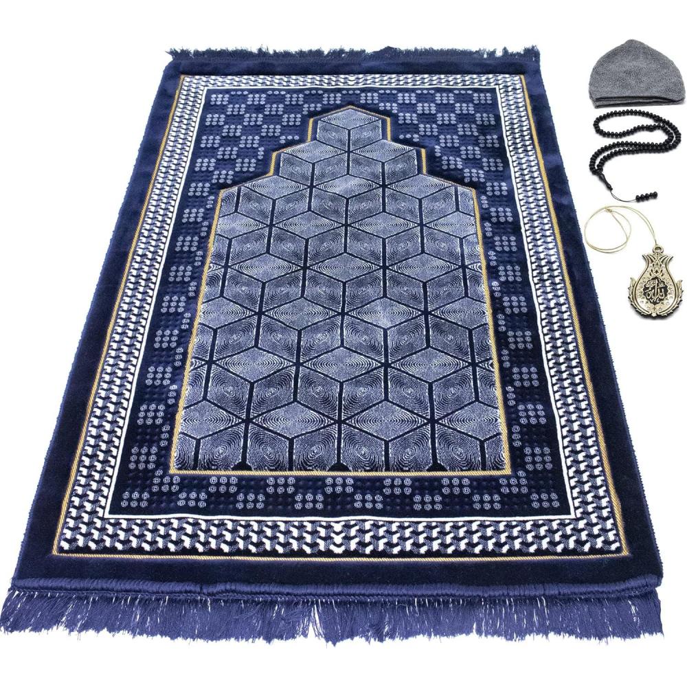 Modefa Turkish Islamic Velvet Prayer Rug – Thick Wide Soft Praying Carpet for Men & Women – Double Plush Large – Eid & Ramadan Gift with Kufi Beads & Car Hanger – Geometric Noor (Dark Blue)(Dark Blue)