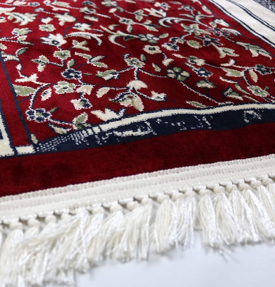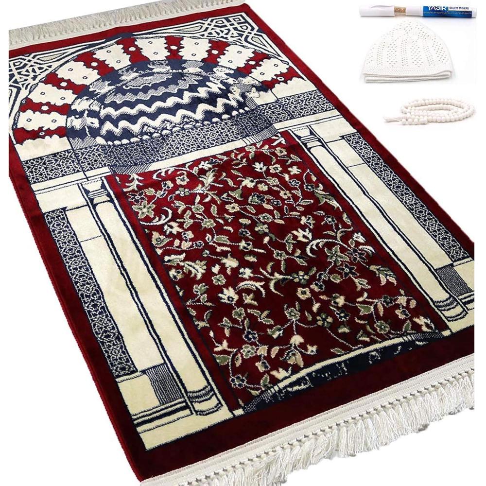 Modefa Velvet Prayer Rug | Soft Plush Janamaz for Men Women Ramadan Eid Gift with Miswak, Kufi, Tesbih Thick Kilim Style Turkish Carpet Musallah Sajadah Mihrab (Red)(Red)