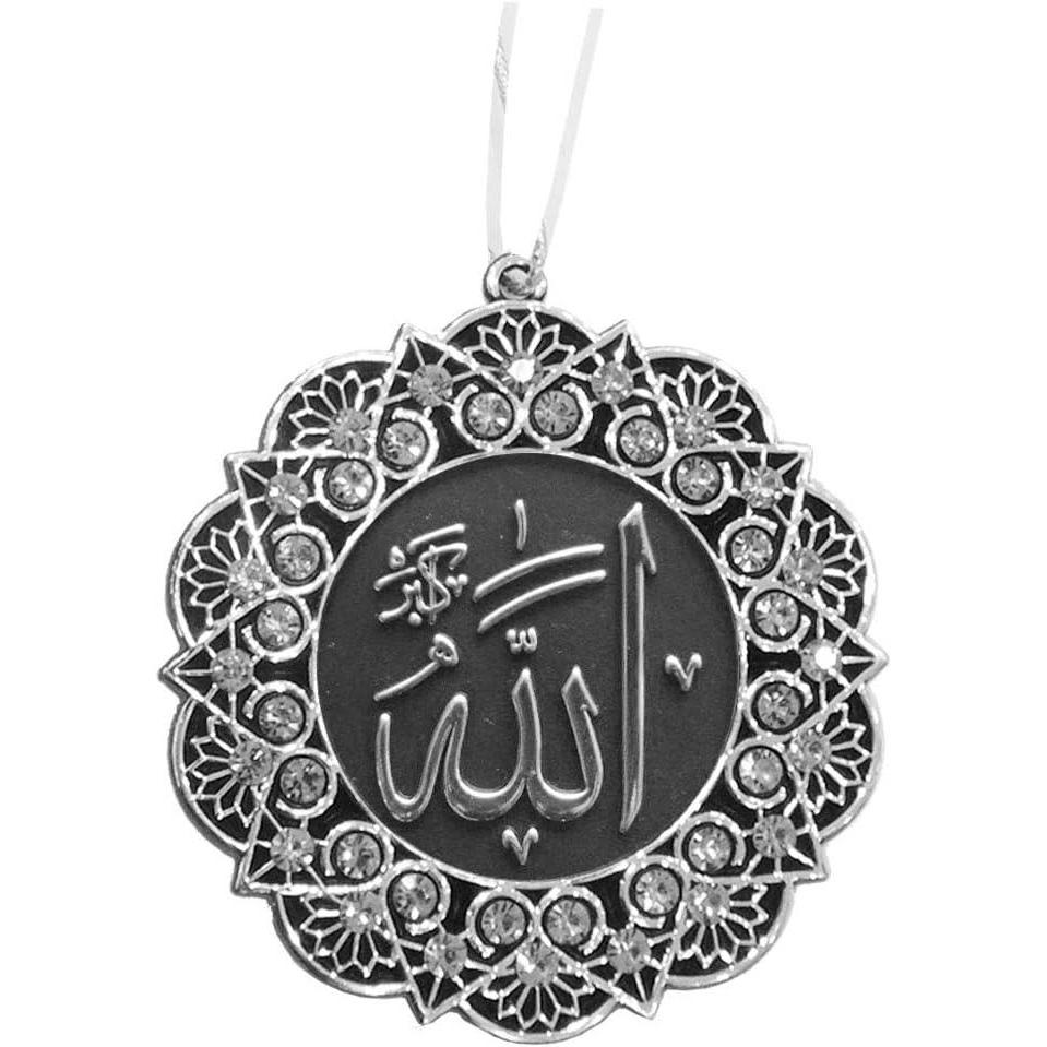 A unique addition to our home decor line! This star shaped, double sided car hanger features Allah and Muhammad in intricate Arabic calligraphy. The rhinestones embedded throughout are an exquisite final touch, making this piece the perfect car accessory! Available in several awesome colors! Material: Plastic Diameter: 7cm (2.75in) Cord length of each may differ slightly; varies between 6 inches (15cm) and 9 inches (23cm) Made in Turkey